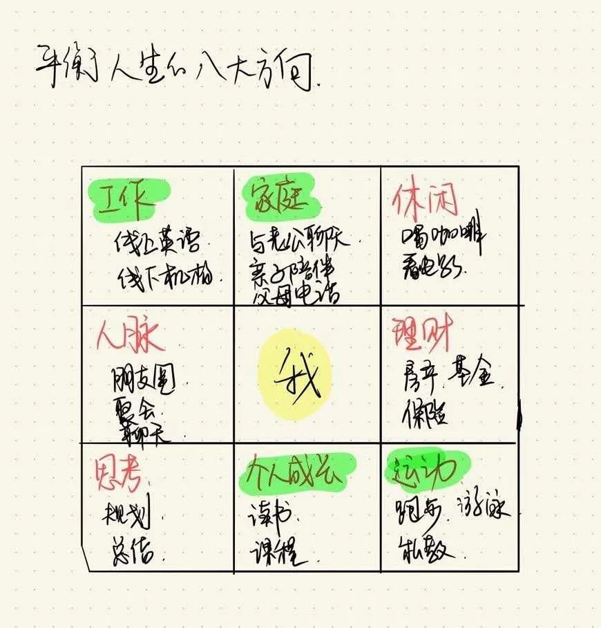 九宫格笔记是一种将整本书的重点通过一张纸来表现的方法,比较适合用来做“致用类”书籍的笔记,