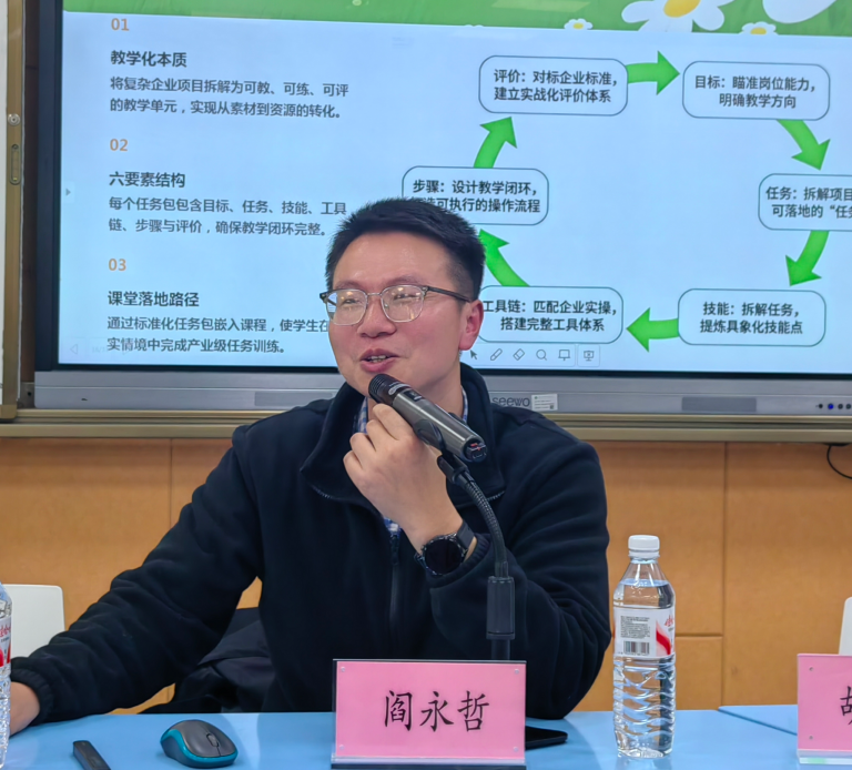 会上,阎永哲院长以宁波大学科学技术学院为例,分享了产教融合的先进经验。产教融合的关键在于校企双方在愿景、表达、方法、节奏、结果上实现“五个对齐”。他阐述了产业学院建设的“四大支柱”——教师产业能力、项目化课程、学生能力链,以及学院的自我造血与运营机制。在教师能力提升方面,阎院长提出了从“知识型教师”到“产业教师”的五阶段跃迁模型,真正的产业学院教师需要具备对真实企业岗位的深度理解与拆解能力,才能将企业项目有效转化为教学资源。