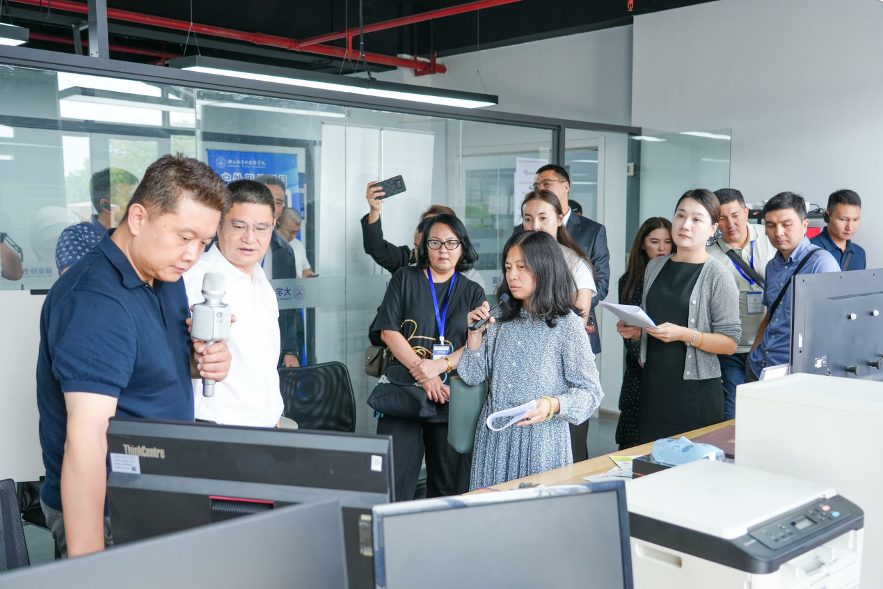 2025年9月23日上午,由浙江省自由贸易发展中心(金砖国家特殊经济区中国合作中心秘书处)主办的“吉尔吉斯斯坦跨境电商与数字营销发展研修班”学员一行莅临我校大学生创业园进行参观交流。学校对远道而来的客人表示了热烈欢迎。