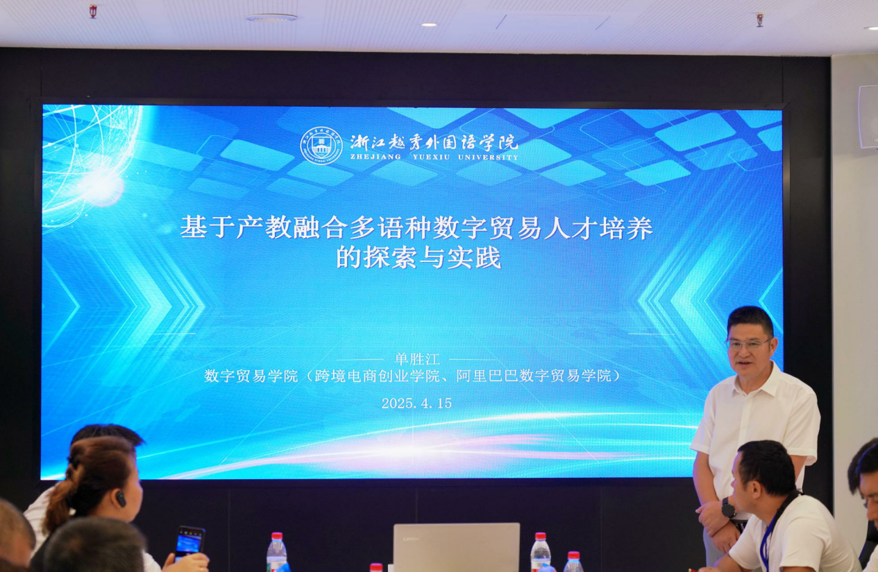 紧接着,单胜江院长围绕“产教融合背景下的多语种数字贸易人才培养的探索与实践”主题进行了详细介绍。他分享了我校在对接区域经济发展需求,整合跨境电商、数字营销与多语种优势,创新人才培养模式方面的具体举措与阶段性成果,阐述了学校在服务“一带一路”倡议、培养国际化应用型人才方面的思考与规划。