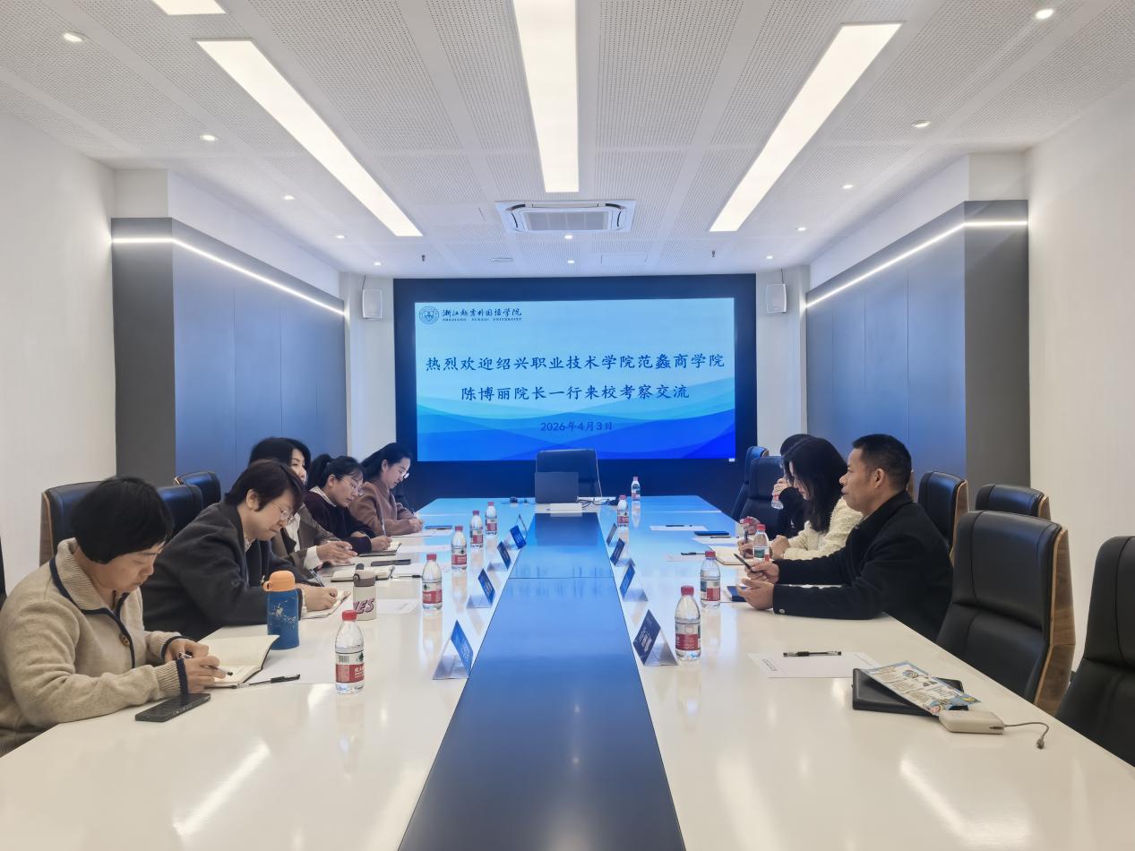 2026年4月3日上午,绍兴职业技术学院范蠡商学院院长陈博丽一行5人来我校数字贸易学院调研交流。双方围绕跨境电商与电子商务专业(群)建设、产业学院及产教融合、创业教育基地及创新创业人才培养等议题进行了深入探讨。我校数字贸易学院相关负责人热情接待了来访嘉宾。