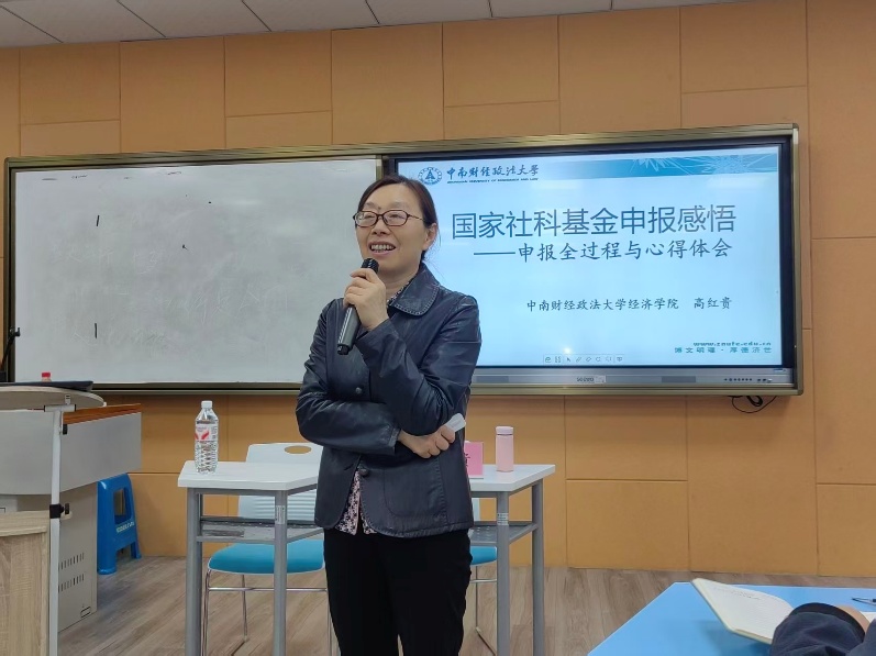 4月22日下午,学院召开2026国家社科基金申报培训会,会议邀请中南财经政法大学博士生导师高红贵教授作专题报告,并现场指导我院2026年国家社科基金申报工作。本次报告会在2-221智慧教室举行,由应用经济学学科带头人付达院教授主持,学院20余位老师参会。高红贵教授是生态经济学领域的知名学者,现任中国生态经济学学会生态经济教育委员会副会长兼秘书长,在环境治理与绿色发展研究方面成果丰硕。她于2013年获得国家社科基金一般项目立项(课题为《生态文明建设融入经济建设体制机制研究》),此后主持的课题《偏向性减排目标约束下城市环境协同治理及优化路径研究》再度获2023年度国家社科基金立项,近年来持续活跃在学术前沿。指导现场,高红贵教授结合自身申报经验,围绕国家社科基金申报的全过程展开详细讲解。从选题、文献综述到论证活页中的各环节,她系统梳理了申报中需注意的关键问题。高教授强调,选题要紧扣时政热点,突出问题导向、学科导向和目标导向,把握好尺度,并注重学科交叉;文献综述要遵循学术规范,为整个课题设计提供支撑。论证环节应做到严谨、扎实,尤其要厘清研究内容与重点、难点之间的逻辑关系。在互动环节,高教授耐